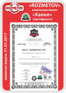“Ҳалол” стандартлаштириш ва сертификатлаштириш халқаро марказининг мустақил комиссияси “Rozmetov” маҳсулотларининг Ҳалол талабларига мувофиқлигини тасдиқлади. Ҳалол сертификати – фойдаланилаётган хомашё (шу жумладан қўшимчалар ва зираворлар), шунингдек, ишлаб чиқариш биноларининг ўзи, жиҳозлари, иш (бизнес) юритиш усули ва шунга мос равишда якуний маҳсулот/хизмат Ҳалол талабларига жавоб беришини тасдиқлайди.