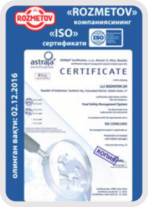 «Rozmetov» корхонаси озиқ-овқат хавфсизлигини бошқариш тизими ISO 22000:2018 халқаро стандартини олди. Бугунги кунда ISO-га дунёнинг 154 та давлати ишонади.